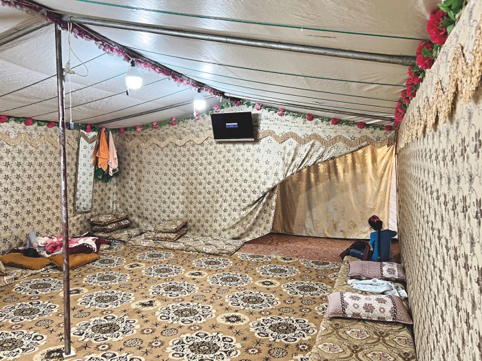 Three rows of tents, a water tank and a chemical toilet cover roughly the size of a football pitch. The biggest tent, sleeping around 20, has been made homely with rugs, sofas, pillows and pink plastic flowers wrapped around the steel poles keeping it up. A tiny TV hangs on the far wall, displaying the words ‘No input signal’.
